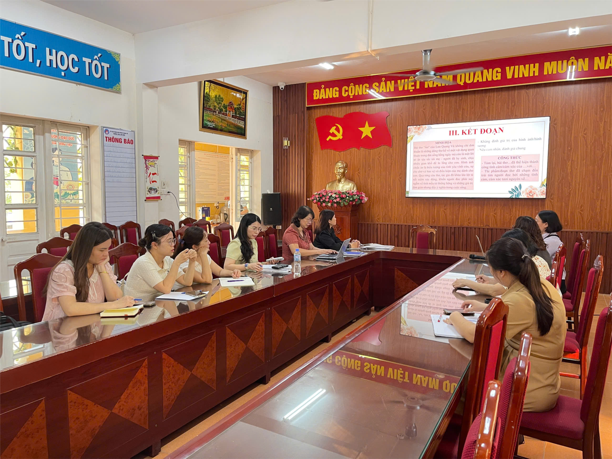 Sáng ngày 07/04/2026, tại Phòng Hội đồng sư phạm, Tổ Ngữ văn – GDCD đã tổ chức buổi trao đổi chuyên môn với sự tham gia của Ban Giám hiệu cùng các giáo viên trong tổ. Chuyên đề do cô Đỗ Thị Thu Hương và cô Đặng Thị Trà Giang thực hiện gồm hai nội dung: “Rèn kĩ năng viết đoạn văn nghị luận văn học về bài thơ/đoạn thơ” và “Rèn kĩ năng viết đoạn văn nghị luận văn học về một tác phẩm/đoạn trích truyện”.