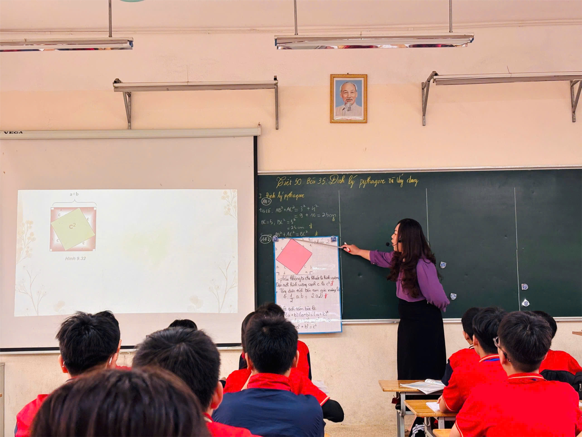 Điểm sáng của tiết dạy nằm ở cách cô tổ chức các hoạt động nhóm. Trong phần Hình thành kiến thức, thay vì áp đặt công thức có sẵn, cô Nga đã hướng dẫn học sinh thực hiện nhiệm vụ đo đạc và so sánh giá trị để chứng minh định lý.
