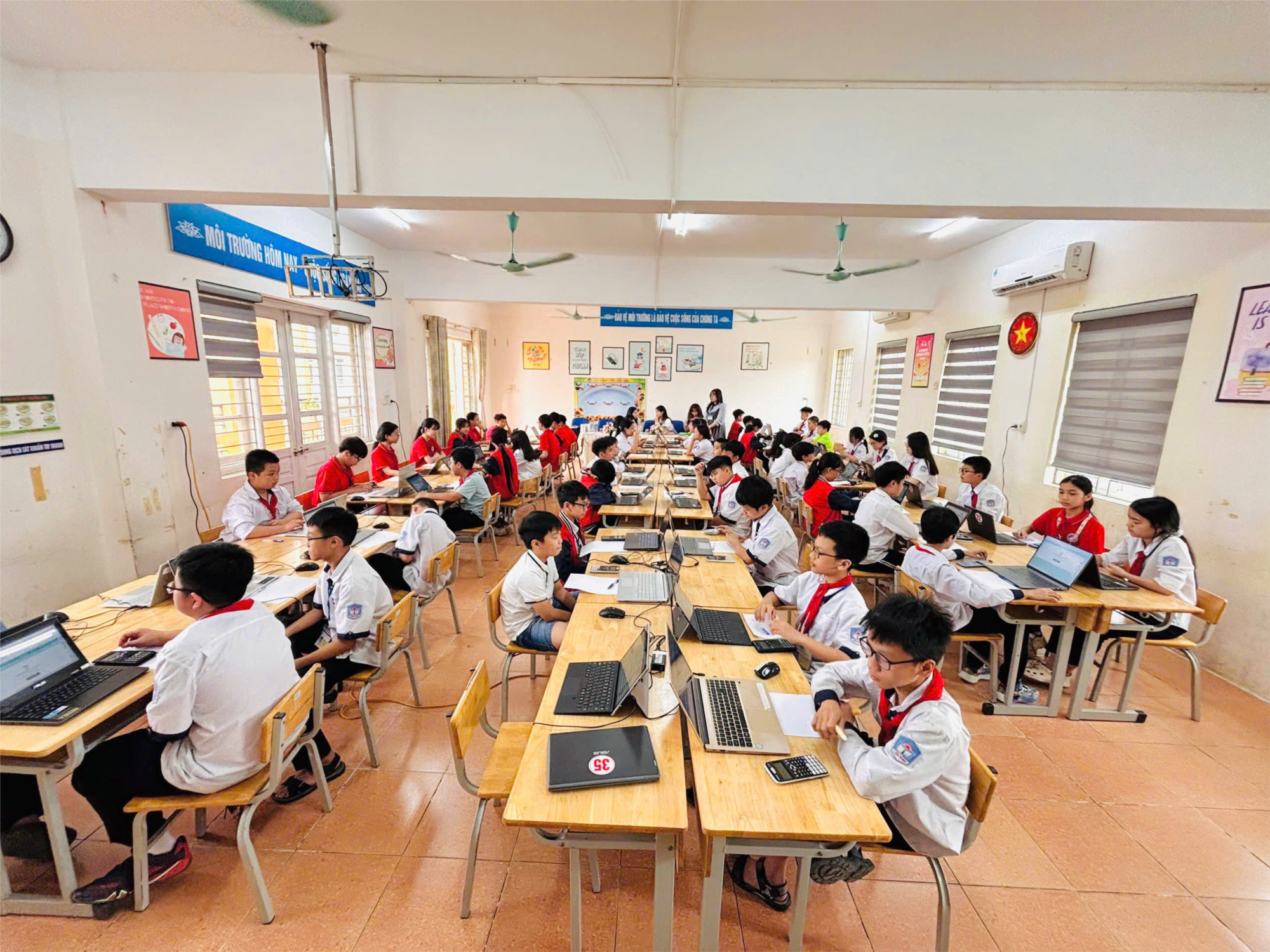 Nhà trường cũng đã chuẩn bị chu đáo về cơ sở vật chất nhằm đảm bảo điều kiện tốt nhất cho học sinh tham gia thi. Phòng học được bố trí khoa học, hệ thống máy tính, đường truyền internet, thiết bị hỗ trợ học tập được kiểm tra kỹ lưỡng trước khi kỳ thi diễn ra. Các thầy cô giáo trực tiếp hỗ trợ kỹ thuật, hướng dẫn học sinh đăng nhập và ổn định chỗ ngồi để các em bước vào phần thi một cách thuận lợi.