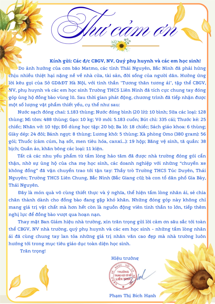 Trước tiên, trường THCS Liên Ninh xin được gửi lời cảm ơn chân thành đến tất cả quý phụ huynh, các em học sinh cùng toàn thể CB-GV-NV nhà trường đã chung tay trong buổi quyên góp nhằm hỗ trợ đồng bào khắc phục hậu quả của trận lũ lụt tại các tỉnh phía Bắc trong thời gian vừa qua.