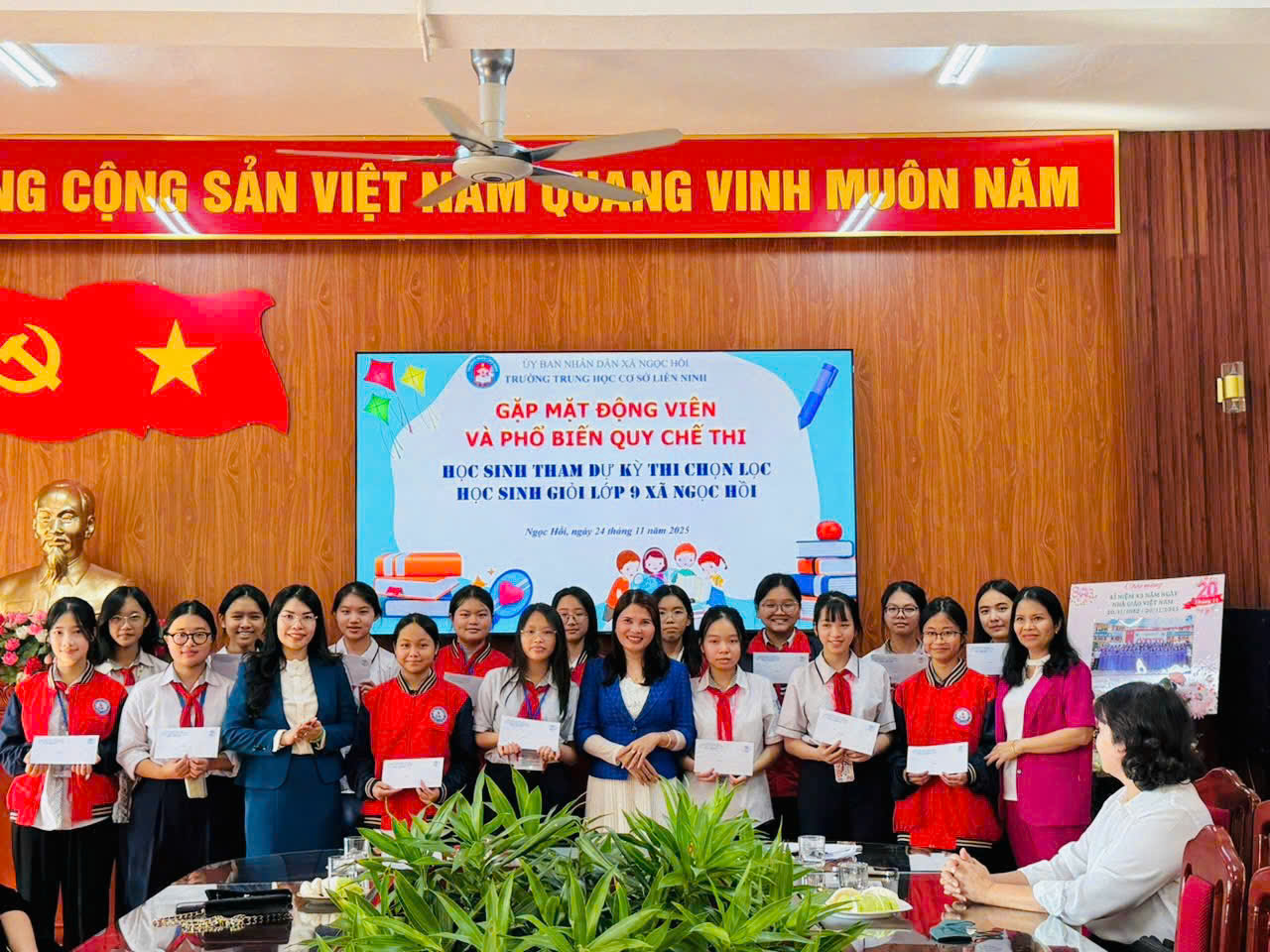 Trong buổi gặp mặt, em Nguyễn Ngọc Khánh Vy (lớp 9A2 – Đội tuyển Ngữ văn) và em Hoàng Đức Trí (lớp 9A1 – Đội tuyển Toán) đã đại diện các thí sinh phát biểu cảm nghĩ. Giọng nói còn đôi chút hồi hộp, nhưng từng lời chia sẻ đều chân thành và đầy quyết tâm. Các em bày tỏ lòng biết ơn sâu sắc tới thầy cô đã tận tình giảng dạy, tới gia đình đã luôn đồng hành, và hứa sẽ cố gắng hết mình để đem vinh quang về cho trường THCS Liên Ninh.