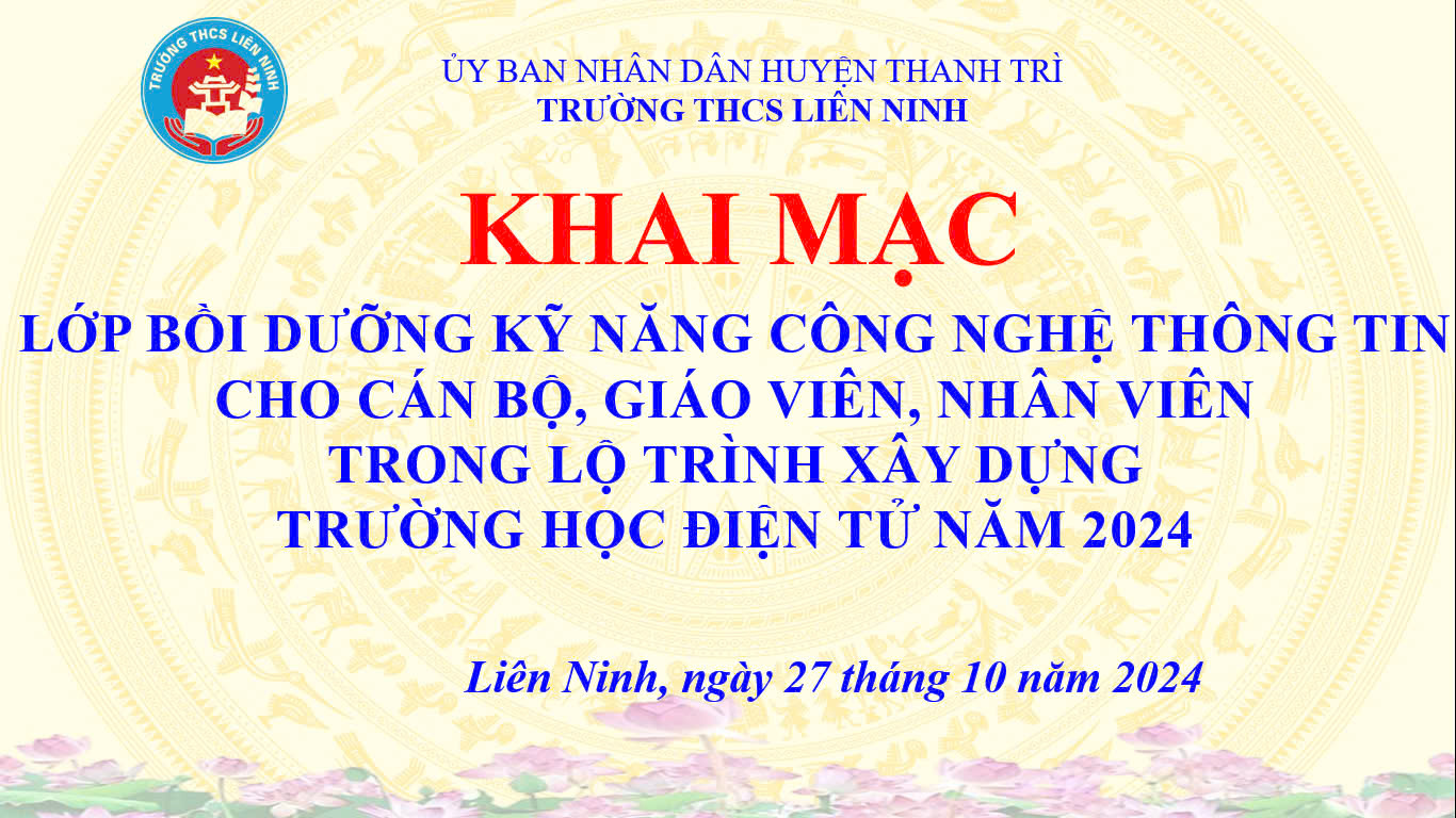 Thực hiện Kế hoạch số 867/KH-GD&ĐT ngày 6/8/2024 của Phòng GD&ĐT huyện Thanh Trì về việc bồi dưỡng kỹ năng CNTT và Tiếng Anh cho cán bộ quản lý, giáo viên, nhân viên các nhà trường THCS trên địa bàn huyện Thanh Trì năm 2024 theo Đề án “Nâng cao chấ lượng GD&ĐT giai đoạn 2021-2026”, sáng nay, ngày 27/10/2024, tập thể cán bộ, giáo viên, nhân viên trường THCS Liên Ninh đã tham dự khai mạc và tham gia lớp Bồi dưỡng kỹ năng CNTT cho đội ngũ cán bộ quản lý, giáo viên, nhân viên trường THCS đang trong lộ trình xây dựng “Trường học điện tử” năm 2024 do Phòng GD&ĐT huyện Thanh Trì tổ chức tại nhà trường.