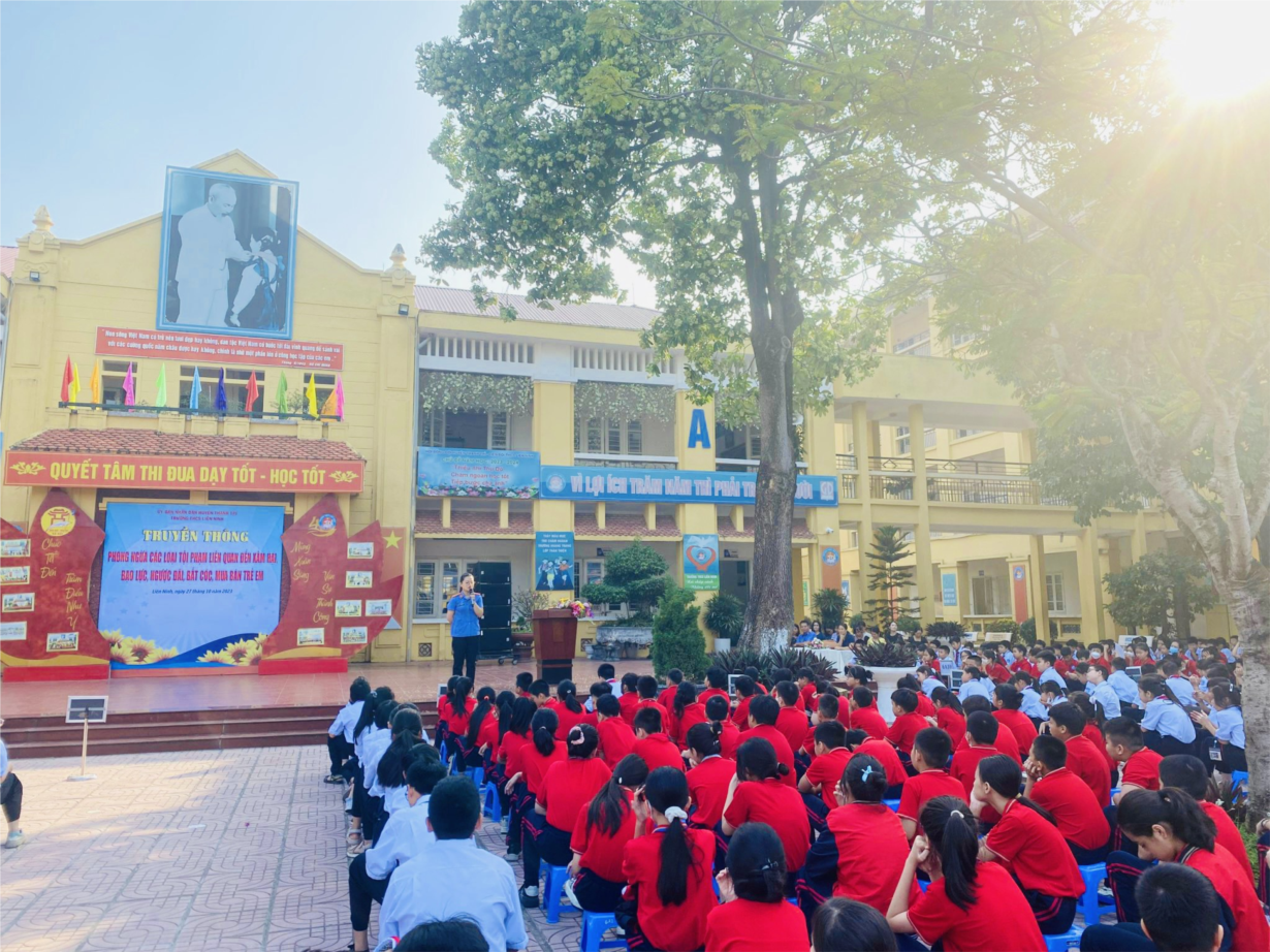 Ở Việt Nam, các loại tội phạm liên quan đến xâm hại, bạo lực, ngượi đãi, bắt cóc, mua bán trẻ em đang trở thành mối lo của phụ huynh, ngành giáo dục và toàn xã hội. Trước đây, chúng ta thường nghĩ rằng các hiện tượng trên là một vấn đề hết sức xa xôi và không xảy ra phổ biến. Nhưng hiện nay, nó không chỉ diễn ra ở thành thị mà còn ở nông thôn, không chỉ xảy ra ở học sinh nam, mà cả học sinh nữ. Nó không chỉ ảnh hưởng đến những người trong cuộc mà còn ảnh hưởng tới cả một thế hệ trẻ, ảnh hưởng trực tiếp tới tương lai của dân tộc. Đặc biệt, trong thời gian gần đây, những hiện tượng đánh nhau của HS ở một số nơi đã bộc bộ những tính chất nguy hiểm và nghiêm trọng. Việc tuyên truyền, cung cấp cho các em học sinh các kiến thức cơ bản về việc phòng ngừa các loại tội phạm liên quan đến xâm hại, bạo lực, ngược đãi, bắt cóc, mua bán trẻ em là hết sức quan trọng và thiết thực. Chính vì vậy, ngày 23/10/2023, trường THCS Liên Ninh đã tổ chức tuyên truyền về bạo lực học đường cho học sinh toàn trường. Sáng ngày 27/10/2023, nhà trường tiếp tục phối hợp với Viện Kiểm sát Nhân dân huyện Thanh Trì tổ chức “Tuyên truyền phòng ngừa các loại tội phạm liên quan đến xâm hại, bạo lực, ngược đãi, bắt cóc, mua bán trẻ em” để giúp các em hiểu thêm nhiều loại hình tội phạm này từ đó có kỹ năng phòng tránh.