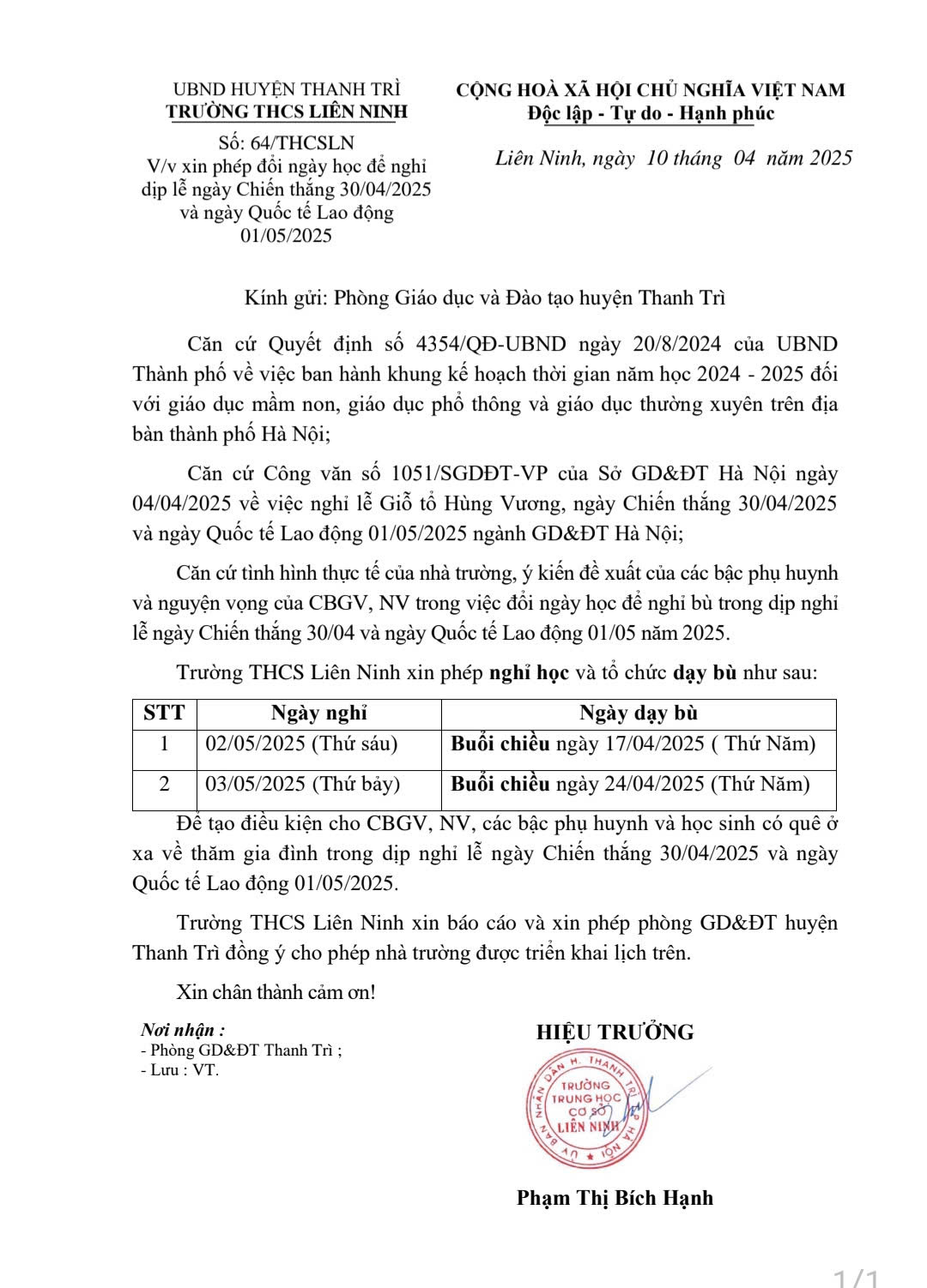 Ngày hiệu lực: 14/4/2025Người ký: Phạm Thị Bích Hạnh - Hiệu trưởng trường THCS Liên Ninh