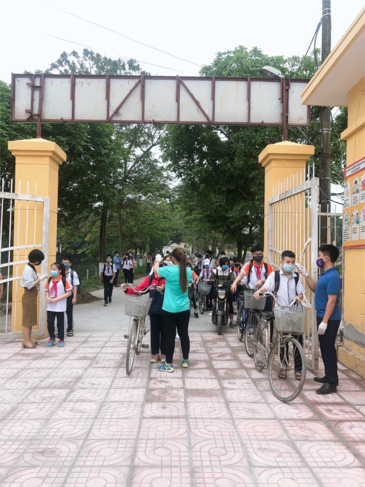 Không chỉ trang bị các máy đo nhiệt ở cổng mà mỗi lớp còn được trang bị một máy đo thân nhiệt. Thầy cô đo thân nhiệt và ghi chỉ số thân nhiệt từng học sinh. Nhà trường tổ chức cho học sinh tất cả các lớp học tách thành 2 ca học theo các ngày chẵn, lẻ. Các em sẽ học tại trường mỗi tuần 3 buổi, 3 buổi còn lại học trên truyền hình và học trực tuyến các buổi chiều trong tuần. Học sinh ngồi học theo sơ đồ giãn cách đúng quy định. Mỗi học sinh ngồi 1 bàn so le để đảm bảo an toàn. 100% học sinh đeo khẩu trang, rửa tay bằng nước sát khuẩn, không dùng chung đồ dùng cá nhân….