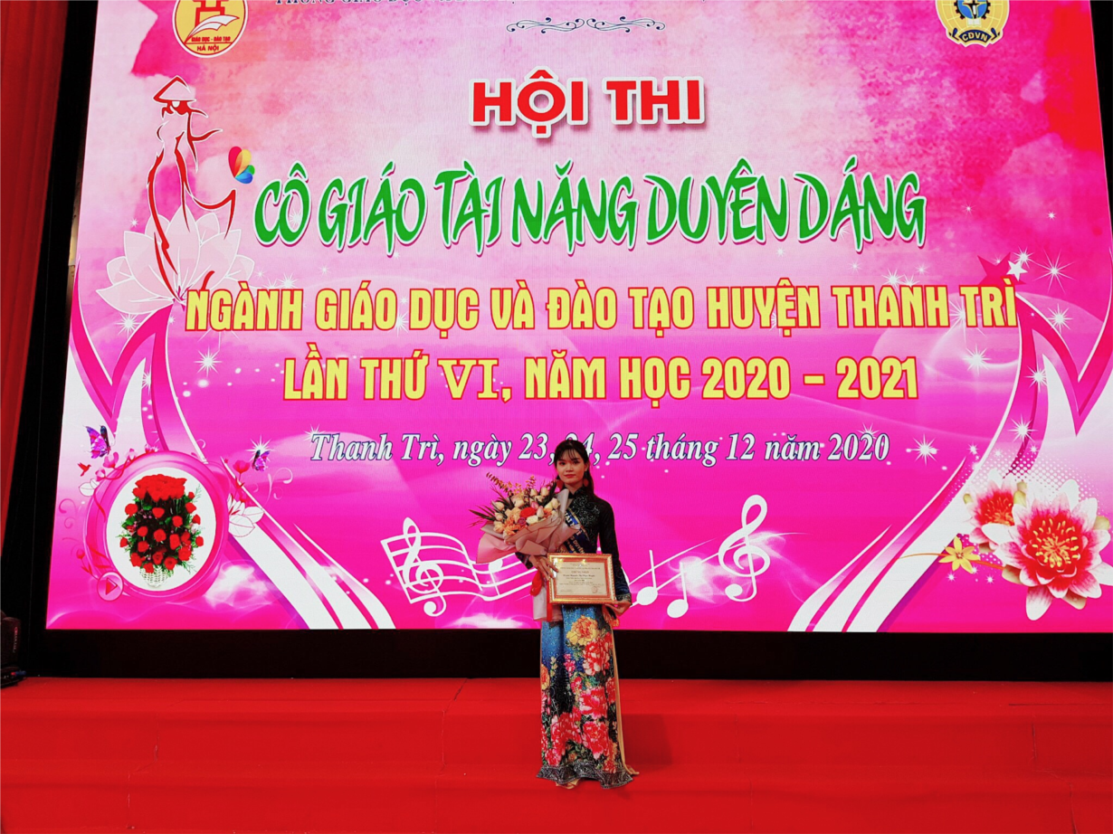 Trải qua 2 nội dung thi với 5 phần thi: Thi trang phục áo dài, trang phục tự chọn, trả lời câu hỏi hiểu biết, xử lý tình huống và thi năng khiếu, cô giáo Ngọc Huyền đã đạt giải Nhì của Hội thi.