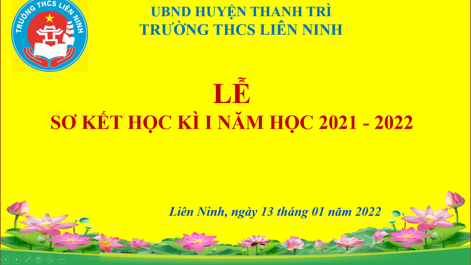 Thực hiện kế hoạch nhiệm vụ năm học 2021-2022, ngày 15/01/2022, Trường THCS Liên Ninh long trọng tổ chức Lễ Sơ kết học kì I năm học 2021-2022 bằng hình thức trực tuyến điểm cầu tại 28 lớp học nhằm đánh giá, tổng kết các hoạt động giáo dục, tuyên dương, khen thưởng giáo viên, những kết quả học tập và rèn luyện toàn diện của học sinh trong HKI đồng thời đề ra phương hướng phấn đấu để hoàn thành xuất sắc nhiệm vụ năm học.